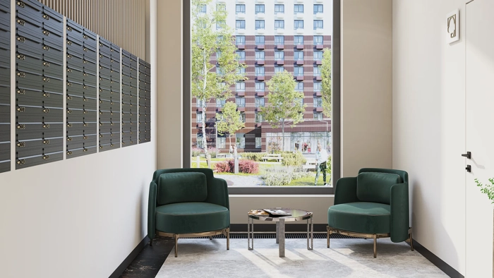 Знакомство с внутренним устройством «Дмитровского неба» начинается с современных дизайнерских лобби. Во входных группах расположены стильные мягкие кресла и журнальные столики.