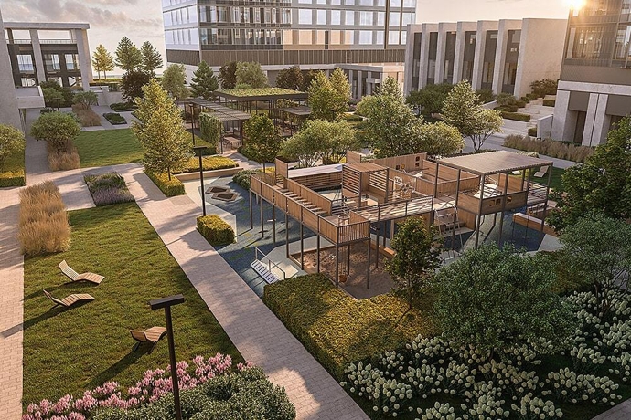 Двор в проекте «Северный Порт» — это среда, насыщенная разнообразными сценариями для жизни. Утром — воркаут на рельефных площадках, днем — семейный пикник на зеленом газоне, вечером — кинопоказ с друзьями в уютном павильоне