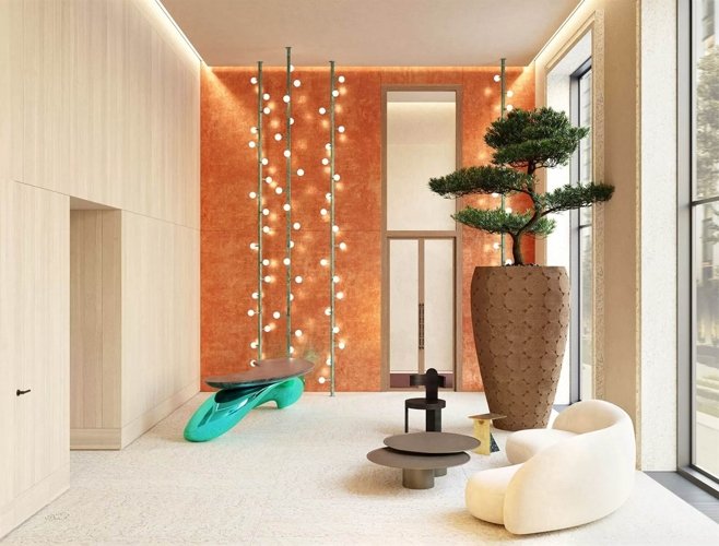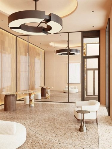 Высокие потолки, панорамные окна и нестандартные системы освещения создают в лобби красивые пропорции и интересные световые сценарии. Различные фактурные поверхности отделочных материалов и тканей привносят тепло и уют.