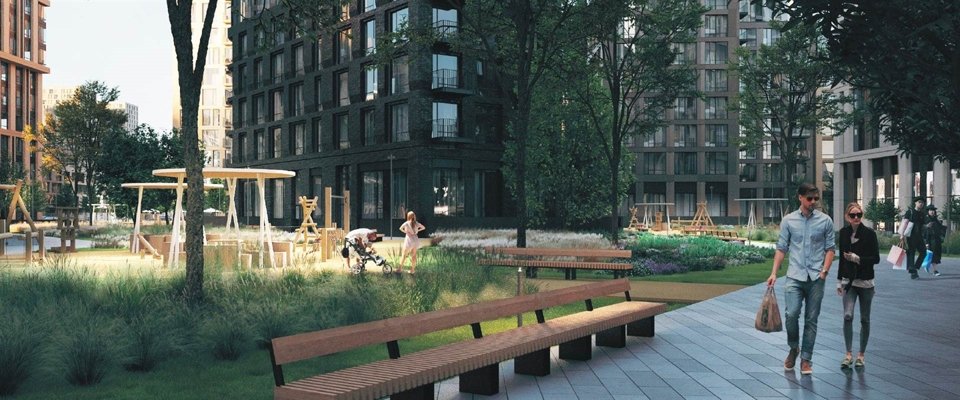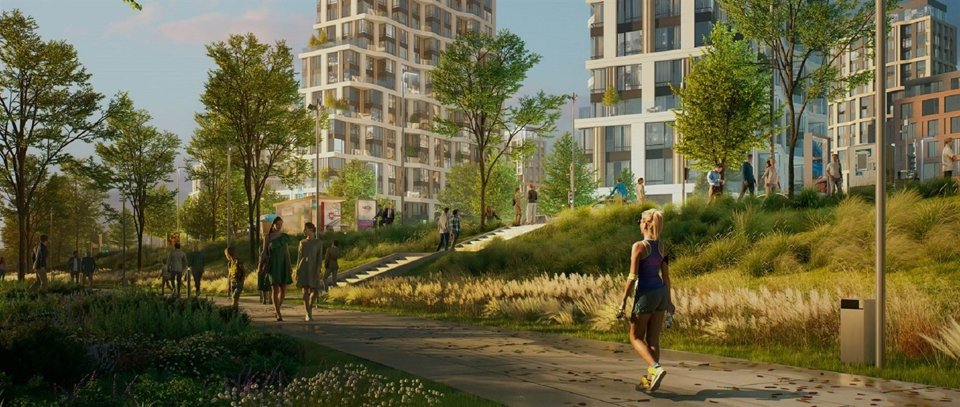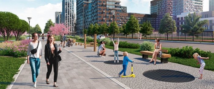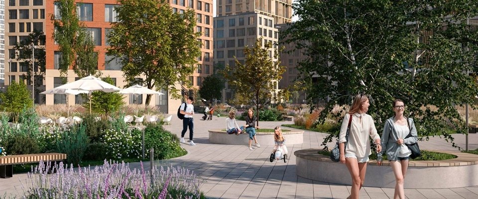 Концепция «15-минутный город». 160 га благоустроенной территории, где уже все готово для насыщенной жизни: лаундж-зоны и коворкинги, магазины и рестораны, прогулочные маршруты и детские клубы в шаговой доступности.